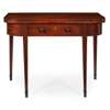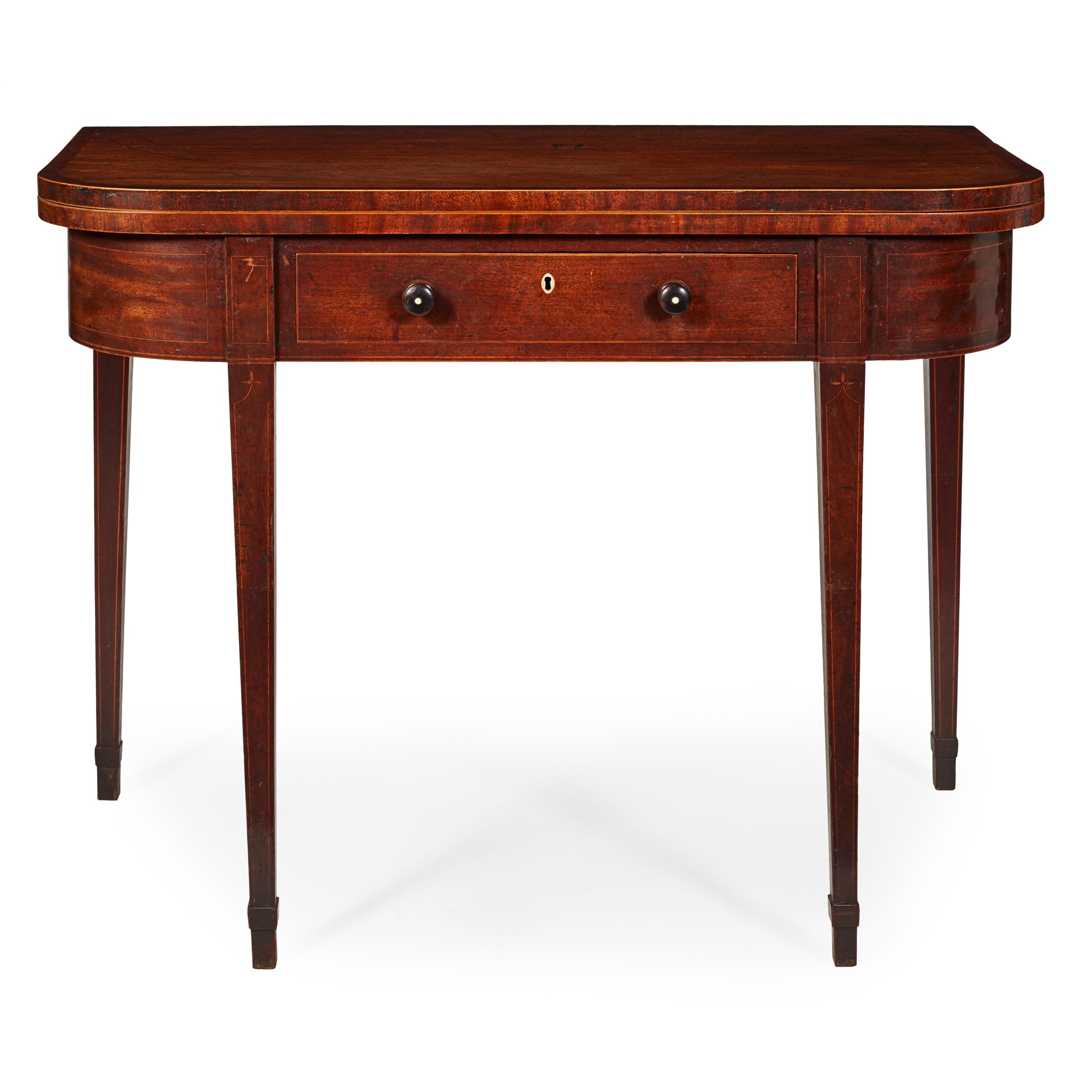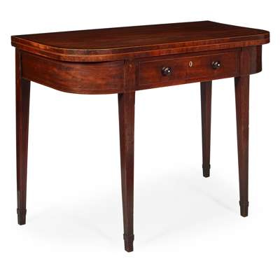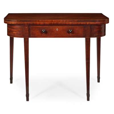 the D shaped fold-over top opening to a green baize lined interior, over a frieze drawer raised on square tapered legs outlined with stringing