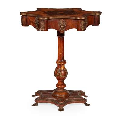 the brass banded shaped hexagonal tops with scrolled foliate marquetry in contrasting veneers, over a frieze with mask mounts, raised on turned baluster columns and conforming hexagonal bases with brass paw feet, with gilt-metal mounts throughout