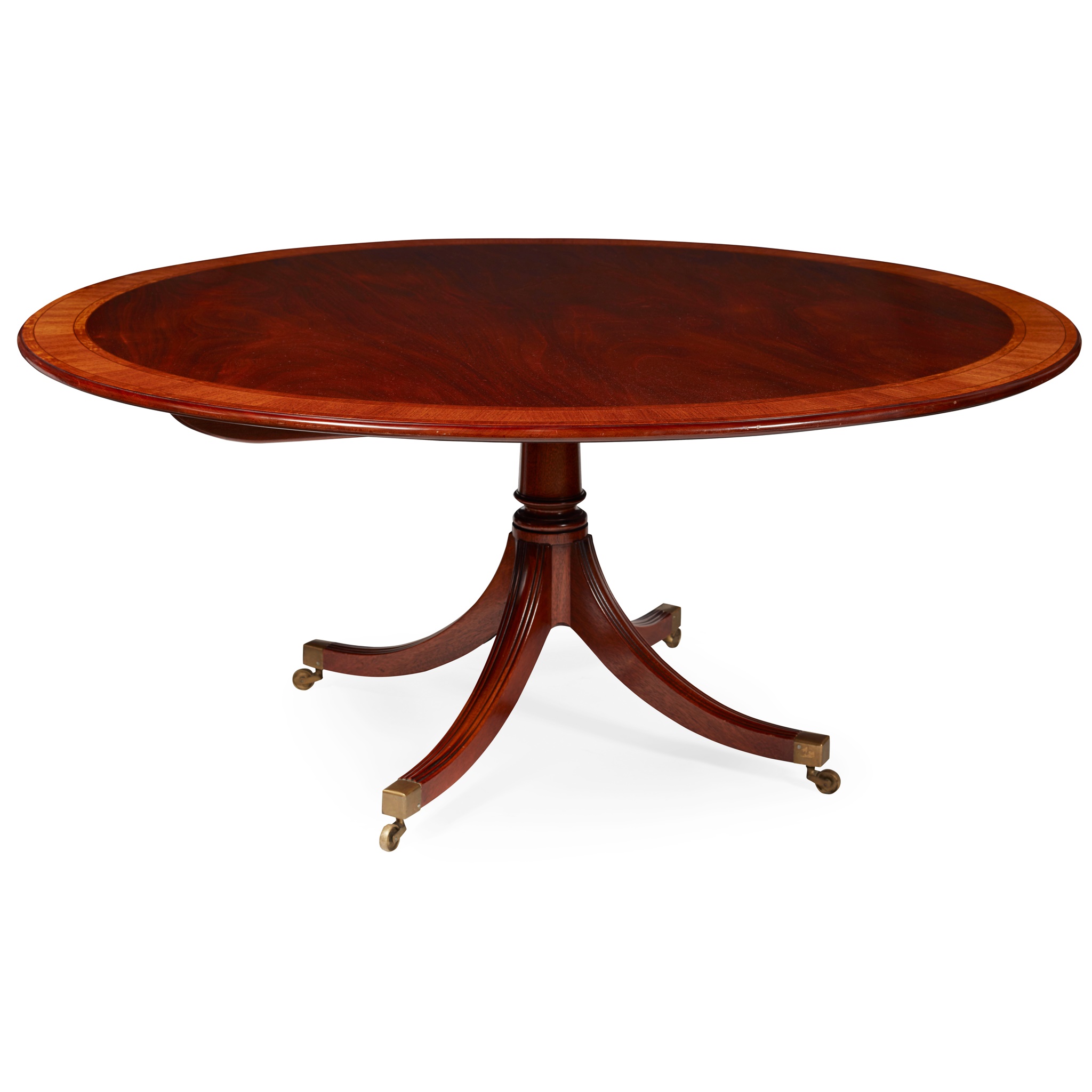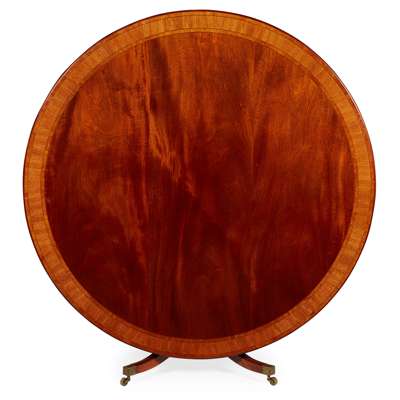 GEORGIAN STYLE MAHOGANY AND SATINWOOD PEDESTAL DINING TABLE