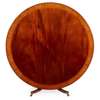 the circular crossbanded top on a cannon barrel column with four channel moulded outswept legs ending in brass caps and castors, with a WILLIAM TILLMAN trade label