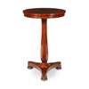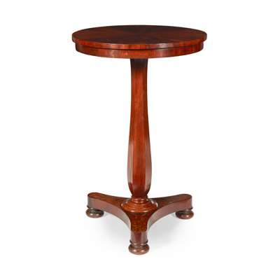 the circular top with segmented veneers, on a facetted baluster column and triform base, on bun feet