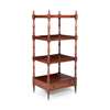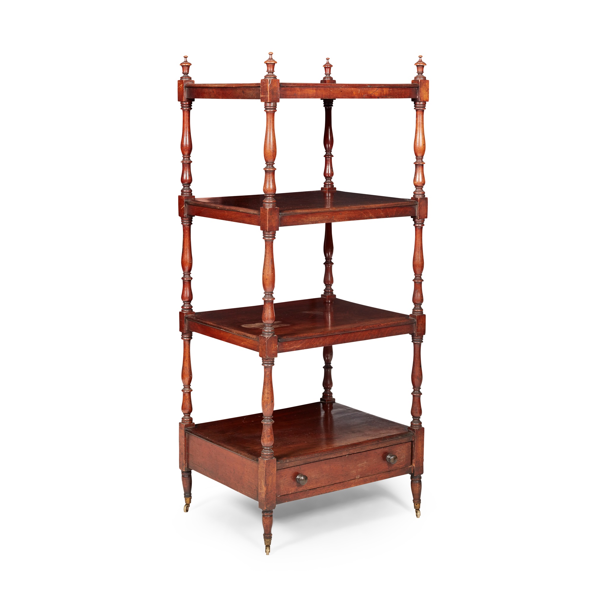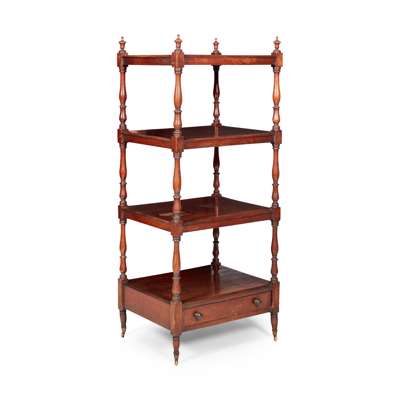 with four tiers raised and divided by turned baluster supports with urn finials, the base fitted with a drawer, on tapered legs with brass caps and castors