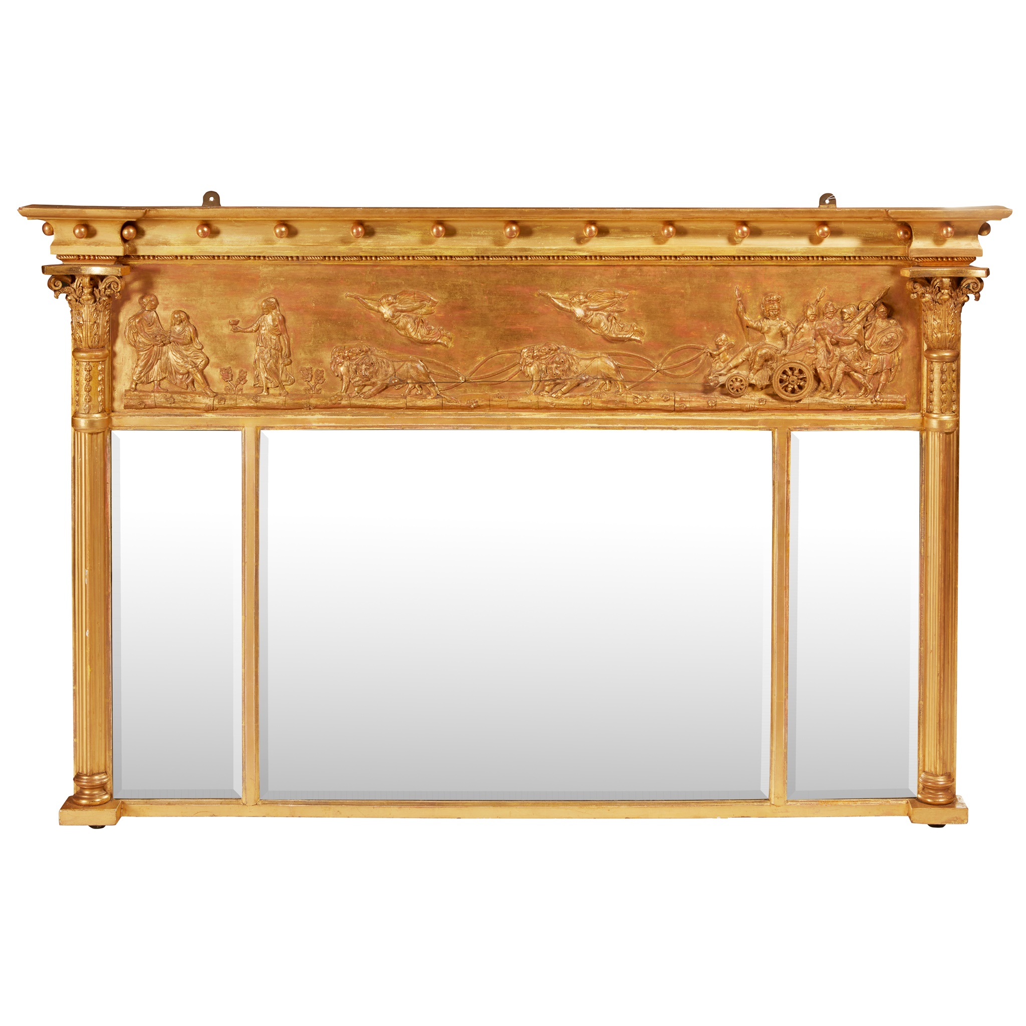 the moulded cornice with ball mounts above a gesso moulded frieze depicting Apollo in his chariot pulled by lions, above triple bevelled mirror plates flanked by reeded columns with foliate capitals