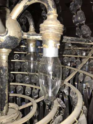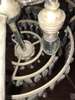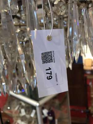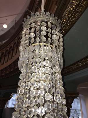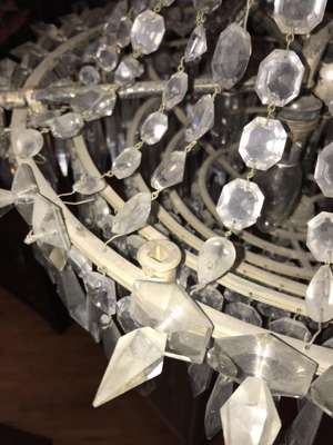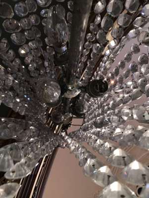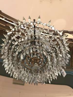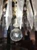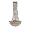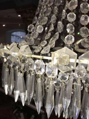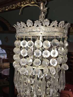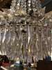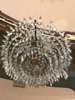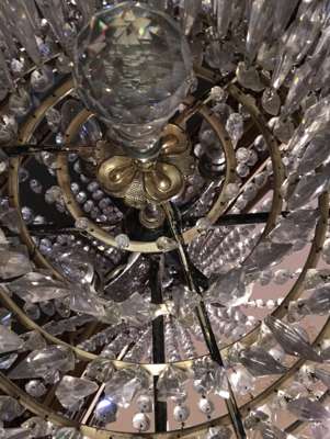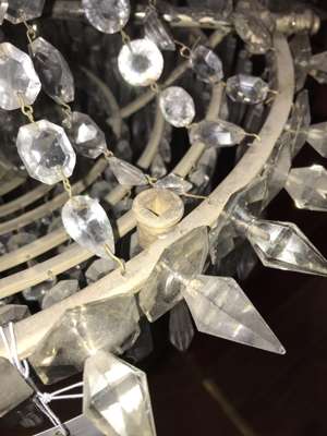 the silvered metal corona hung with prism swags and drops above a tiered waterfall base with a facetted ball pendant finial