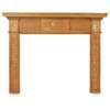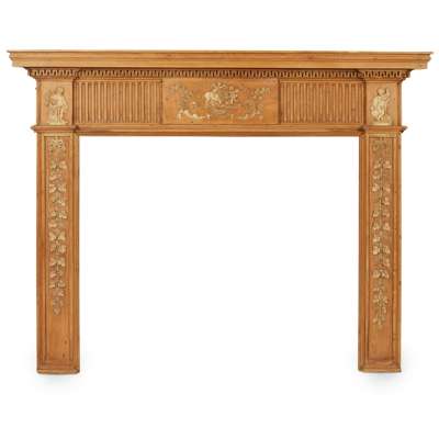 the projecting moulded shelf above a frieze with central flowering urn and fruiting vine pilasters capped by figures