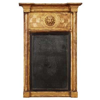 of rectangular form, the projecting cornice above a frieze panel with a central lion mask carving, the mirror plate within a reeded ebonised slip, flanked by two columns