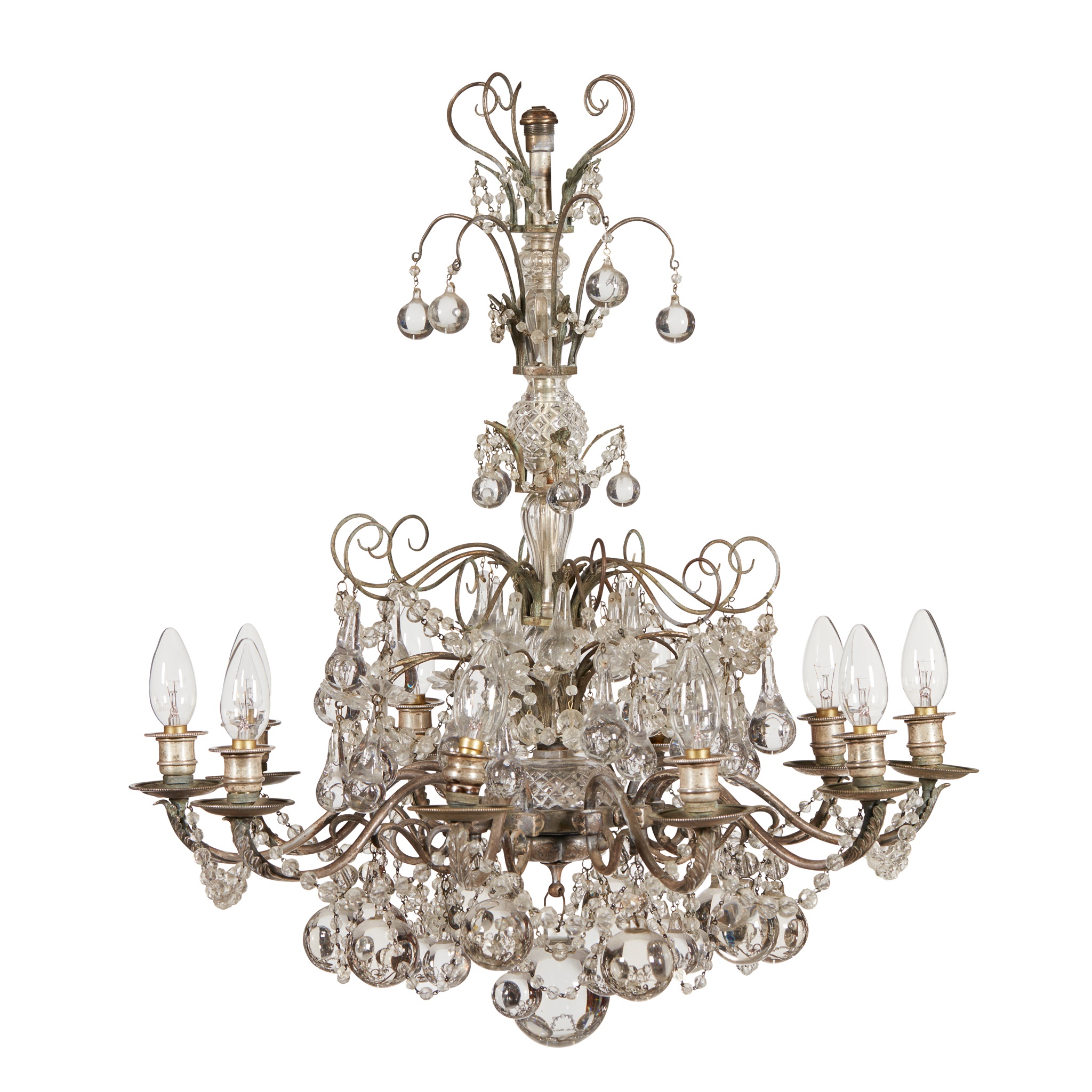 IRISH TEN LIGHT CRYSTAL AND SILVERED BRASS CHANDELIER