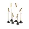 each with a round plinth black glazed earthenware stand, two with a retractable brass rod with stylised leaf decoration, surmounted with a shoe shaped disc, impressed to the base ARCHD HAMILTON, SHOP FITTERS, GLASGOW, the others of similar form, with plain brass stem, the shoe shaped discs marked A M RAMSAY & CO, GLASGOW