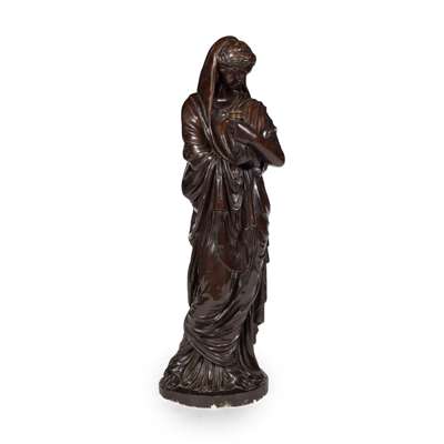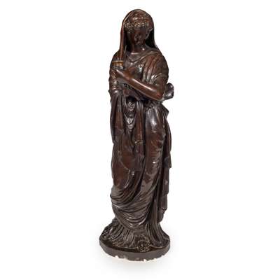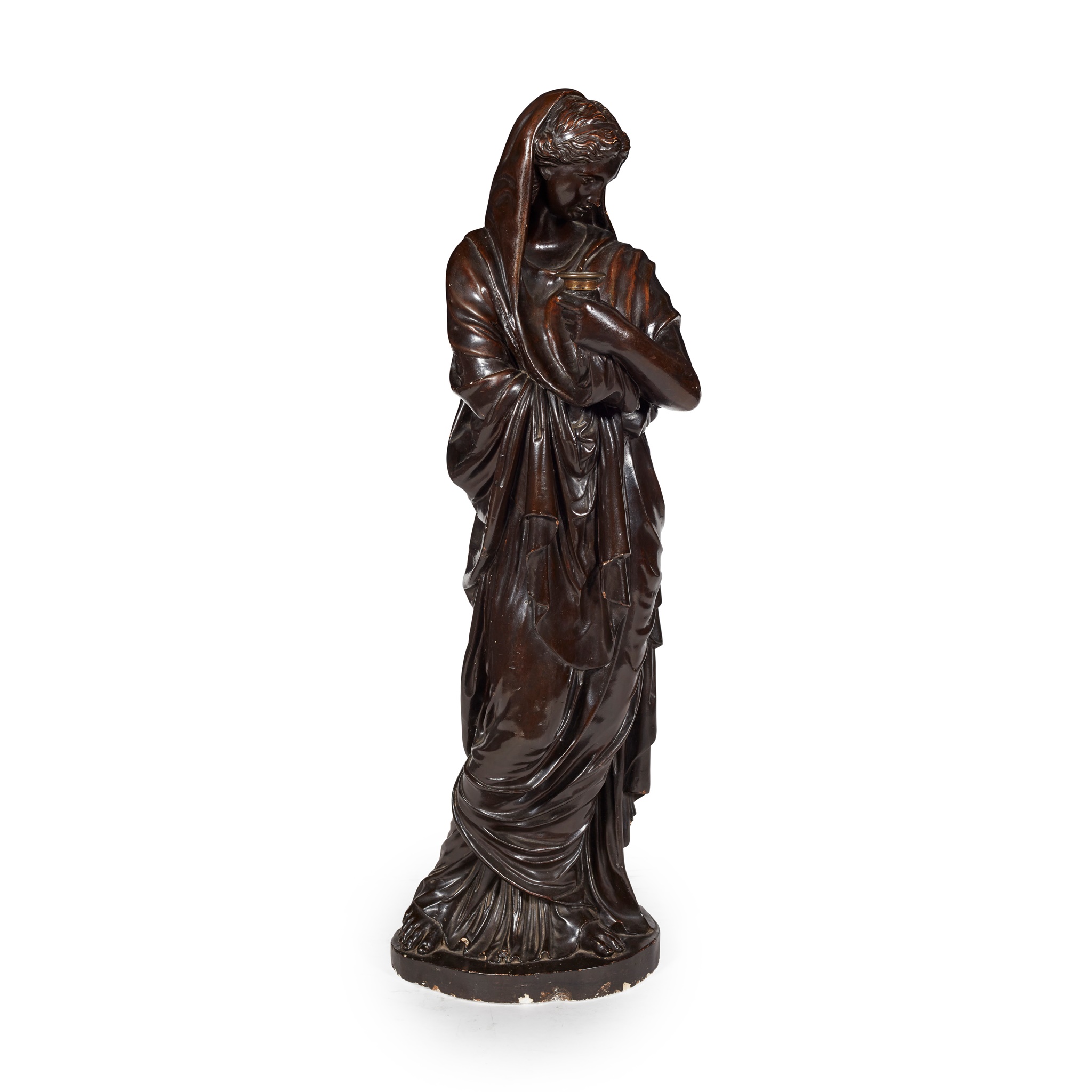 in the form of a Vestal Virgin, painted with a simulated bronze patina, on a circular base, unsigned