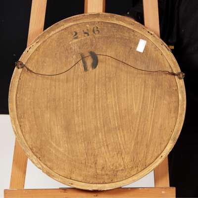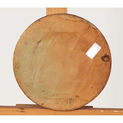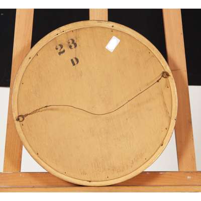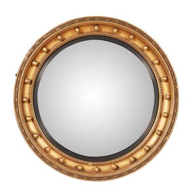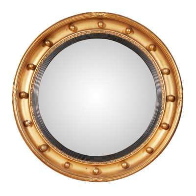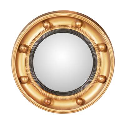 with a circular convex mirror plates in ebonised slips and ball mounted frames