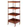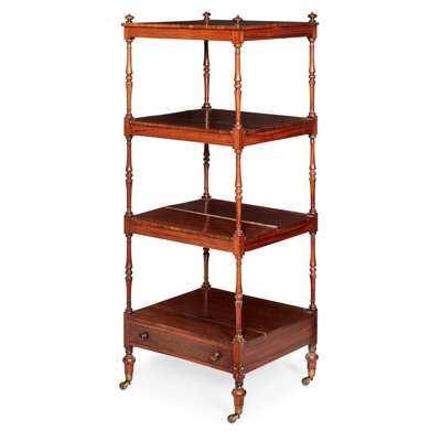 of square form, with four tiers raised on turned supports, the bottom tier with a drawer, raised on turned and tapering legs ending in brass caps and castors