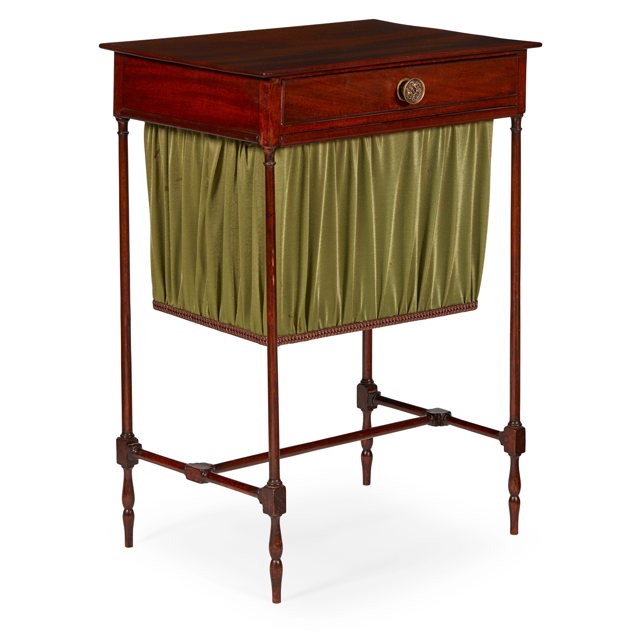 the rectangular top over a frieze drawer and silk-lined basket, raised on slender legs joined by an H stretcher