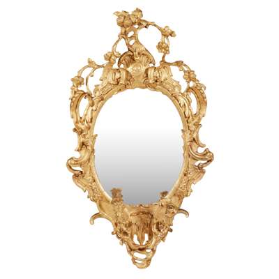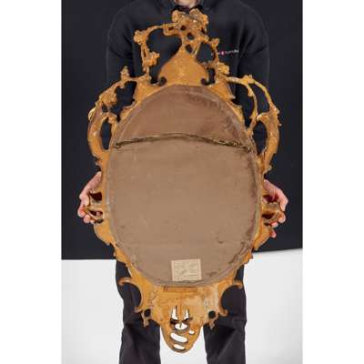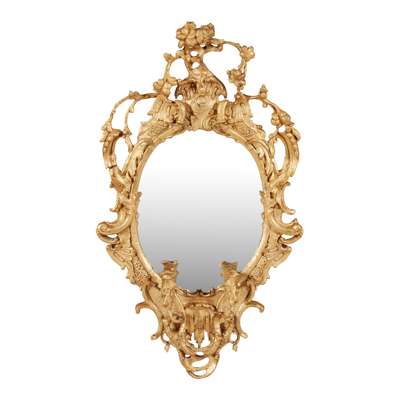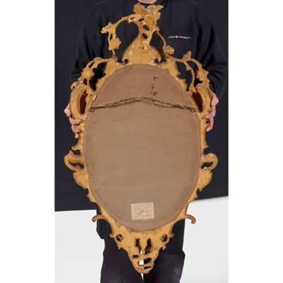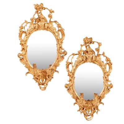in the Rococo Revival style, the oval mirror plates in pierced and carved frames with rocaille, C scrolls, flowers, and issuing twin scrolling candle arms