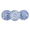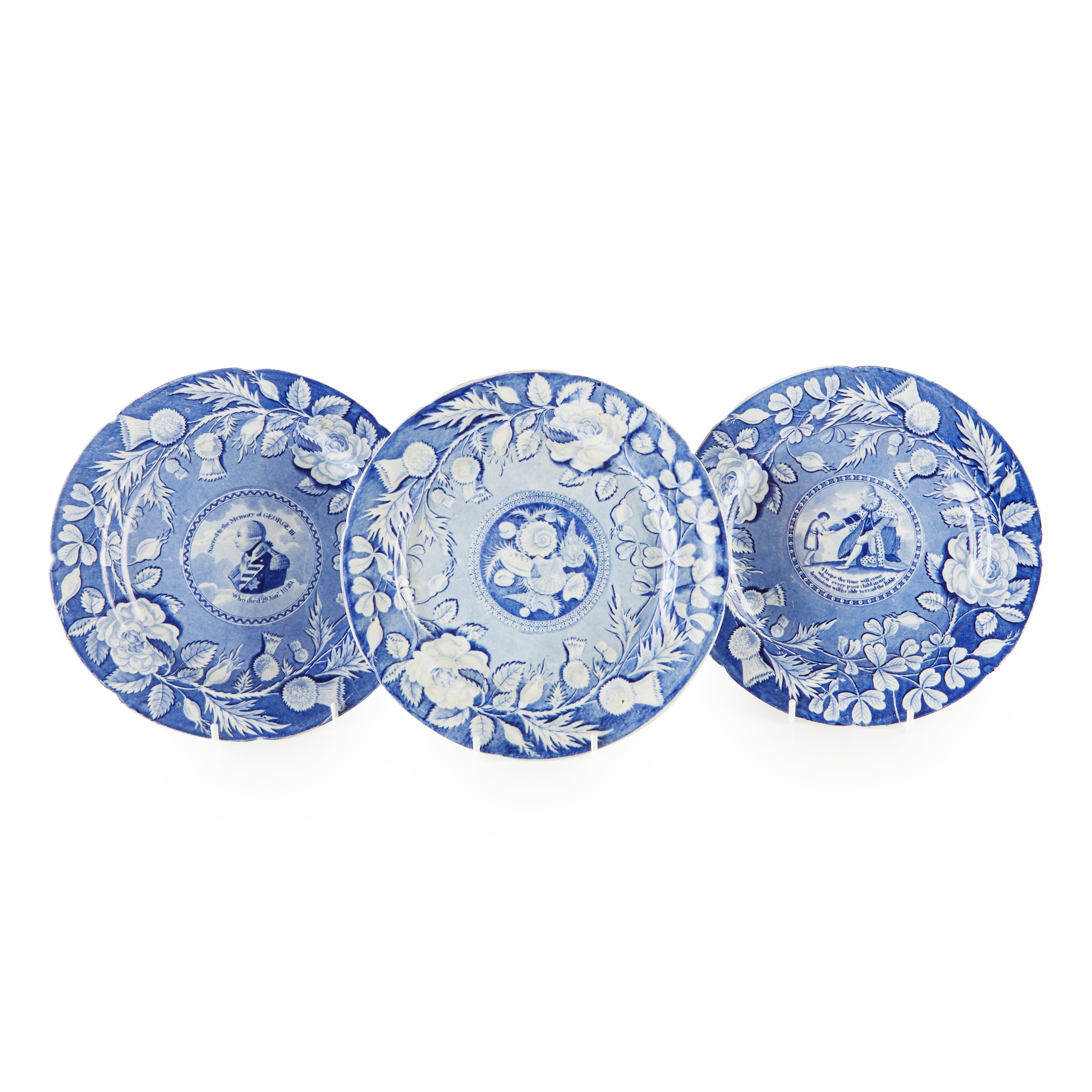 blue transfer decorated with borders of thistles, roses and clover; the first with a profile portrait inscribed 'SACRED TO THE MEMORY OF GEORGE III. / WHO DIED 29 JAN'. 1820'; the other with an image of the subject seated handing a book to a child and inscribed 'I HOPE THE TIME WILL COME/ WHEN EVERY POOR CHILD IN MY/ DOMINIONS WILL BE ABLE TO READ THE BIBLE.'; together with a FURTHER BLUE TRANSFER PEARLWARE DISH, of similar decoration, the central reserve with seashells