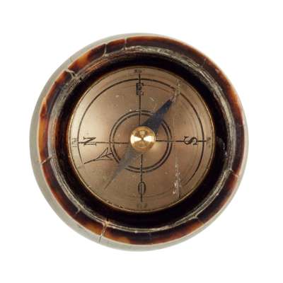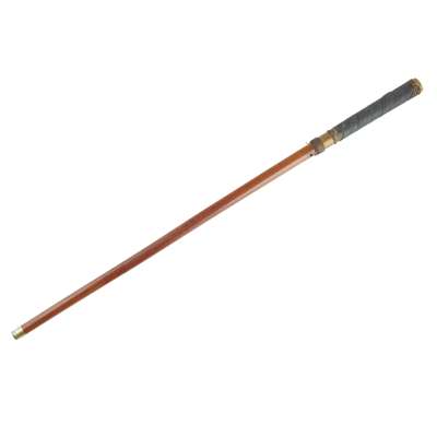 the screw-off pommel fitted with a compass while the removable upper section of the stick fitted with telescopic lenses, bound in shagreen with a woven string collar, the malacca shaft with a brass ferrule; the engine turned brass band stamped PATENT