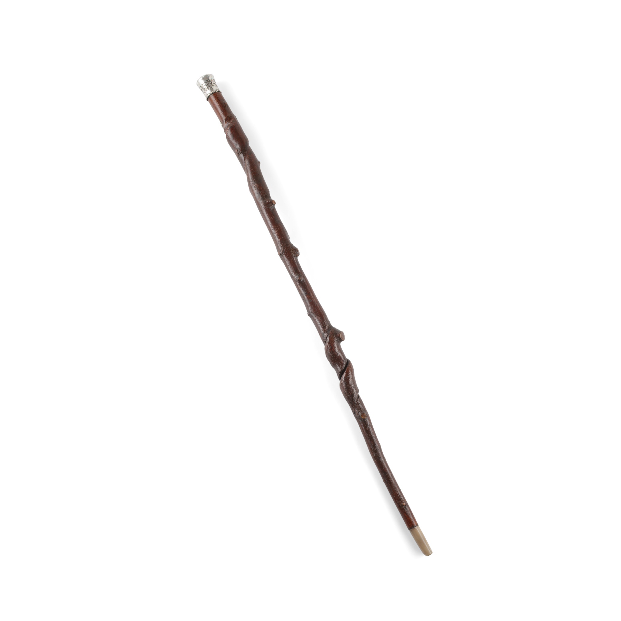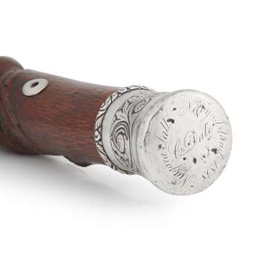 with a twisted natural wood shaft with horn ferrule and white metal pommel embossed with scrolling leaves and a bird, engraved 'C. Dale/ Navy Island Niagara River'