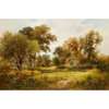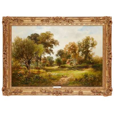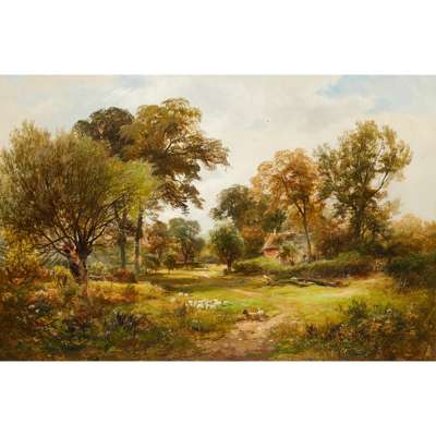A SUMMER LANDSCAPE WITH SHEEP AND COTTAGE