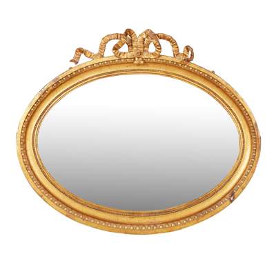 the oval mirror plate in an egg and dart moulded frame with ribbon cresting
