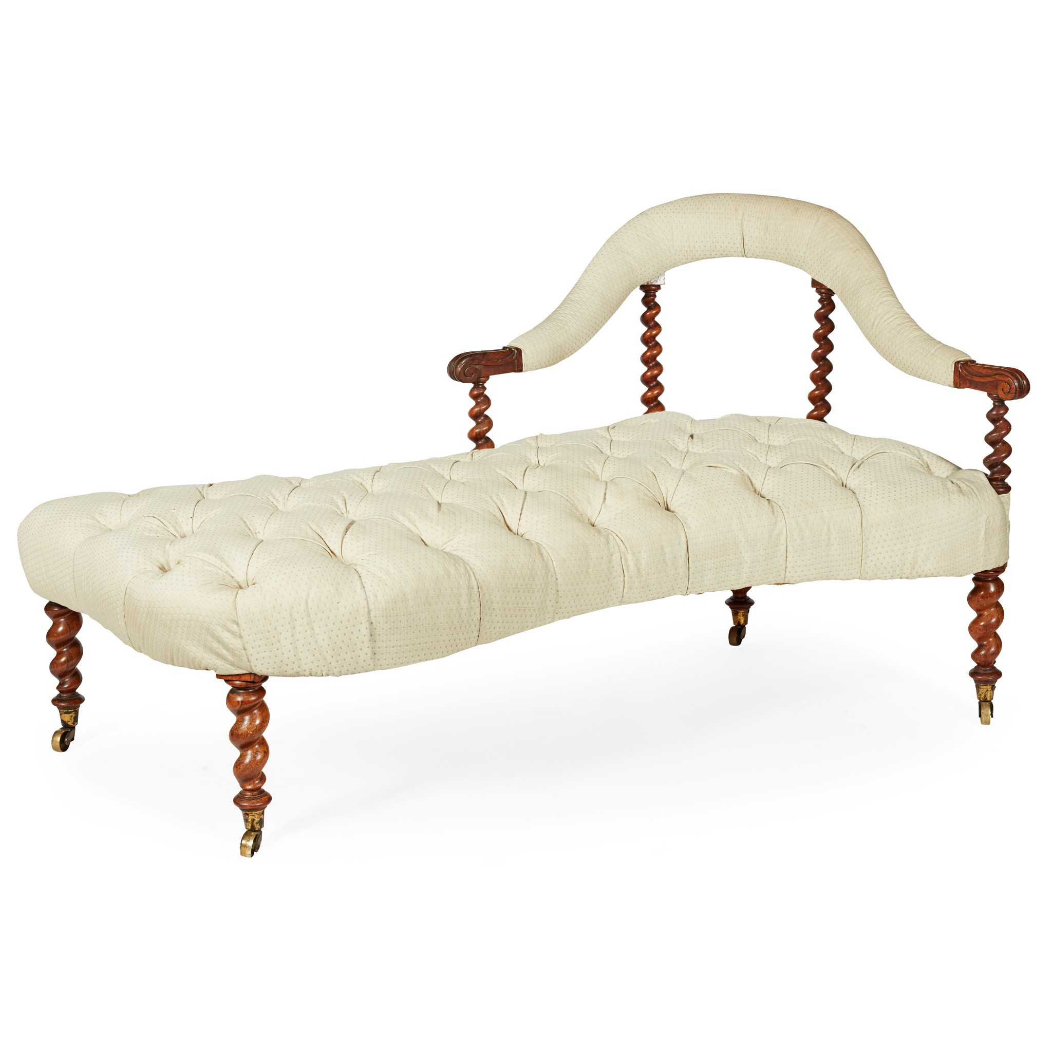 with a padded shaped top rail on spiral turned supports over a button upholstered shaped seat, raised on spiral turned legs with brass caps and castors
