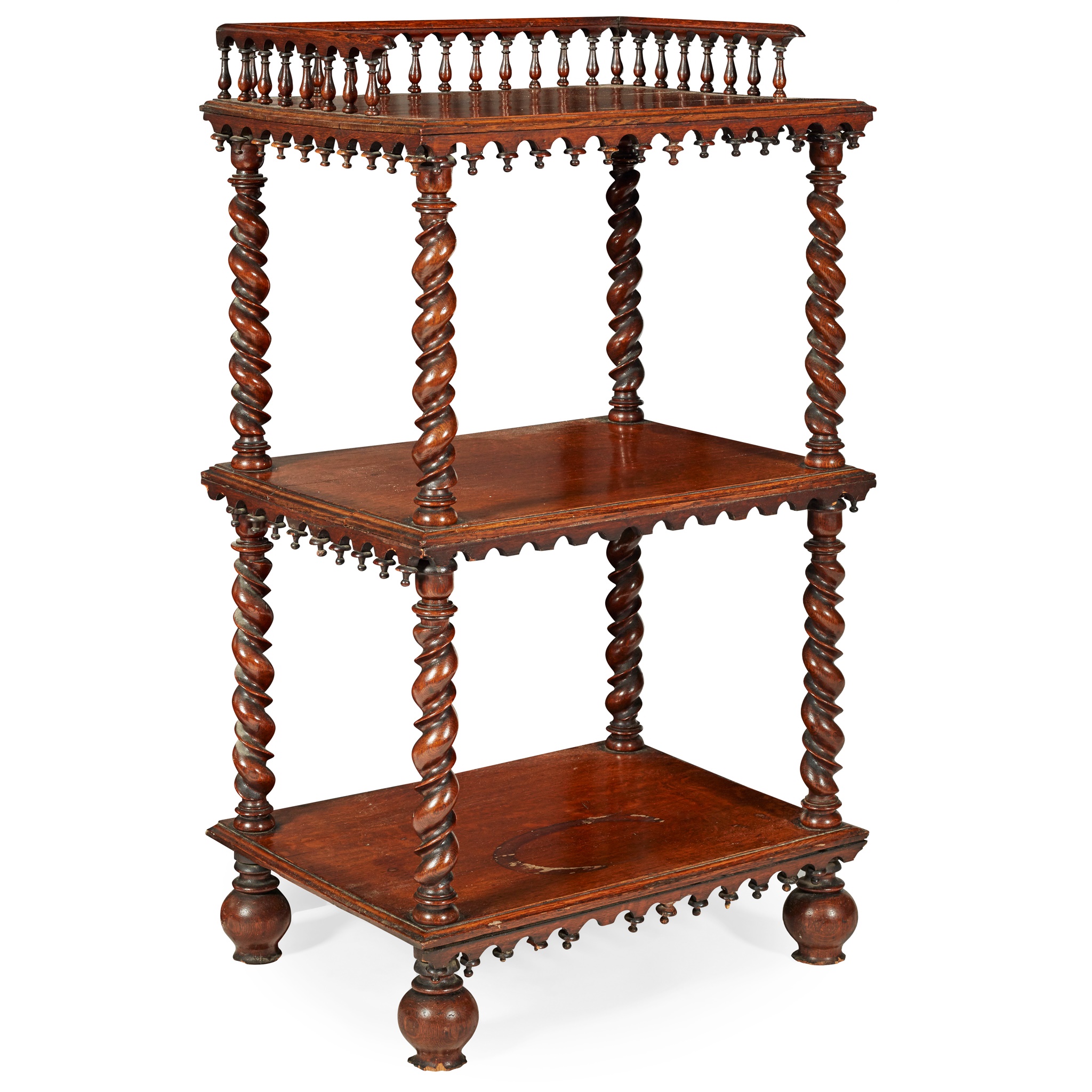 the top with a three-quarter gallery over two further tiers with Gothic arch moulded pendant mouldings, raised and divided by spiral turned supports, on ball feet