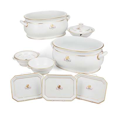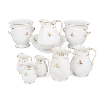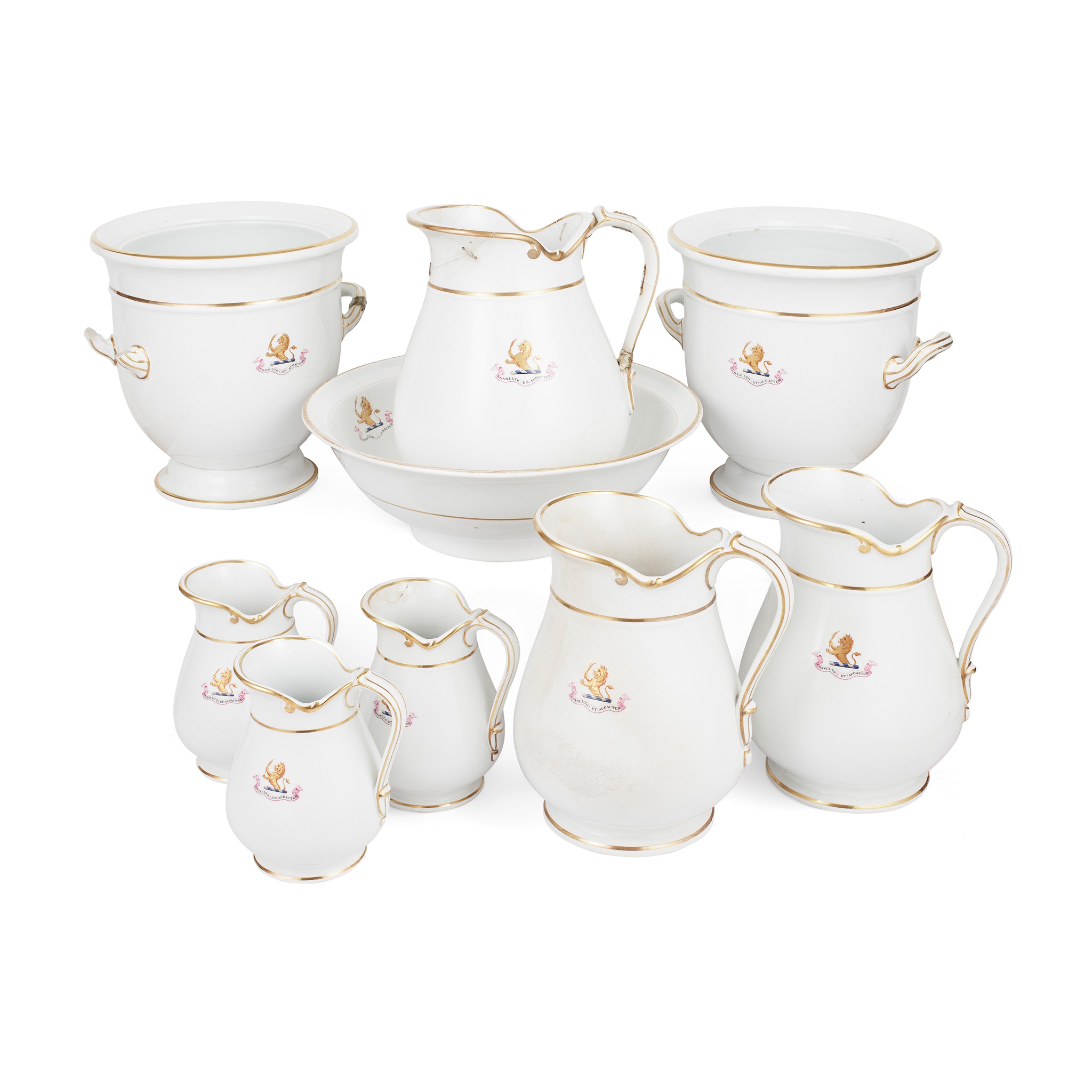 all in plain white earthenware, bearing the crest and motto for the Scott Plummer family, the crest showing a golden demi lion holding a palm branch, above a banner bearing the motto 'Consulto Et Audacter', all with gilt rims and borders, comprising six various ewers, one basin, two foot baths, and two twin handled slop vessels, three rectangular trays with canted corners, two twin handled soap dishes, and one bowl with cover, marked B. B New Stone