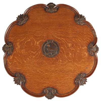 the edge formed from scrolls spaced with alternating plumes and feathers, centred with a carved crest depicting a perching bird on a torse, within a rope twist and flower carved border bearing the initials G.N.B. on a revolving segmented stand with six turned feet