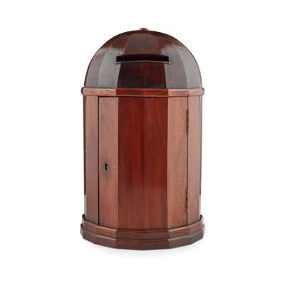 with a faceted dome top fitted with a letter slot, above a conforming columnar body with a door