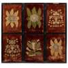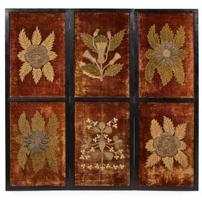 each fold with two panels with applique silk needlework depicting roses, thistles, shamrocks, and lilies, against a faded red velvet ground, the same on the reverse for twelve panels total, in an ebonised frame, bearing a brass plaque engraved 'THIS EMBROIDERY CAME OFF THE DAIS ERECTED AT DELHI/ FROM WHICH/ QUEEN VICTORIA WAS PROCLAIMED EMPRESS OF INDIA/ 1877'
