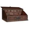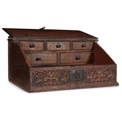 with a hinged slope inscribed 'T8' opening to an interior fitted with drawers, over a front panel carved with scrolling foliage