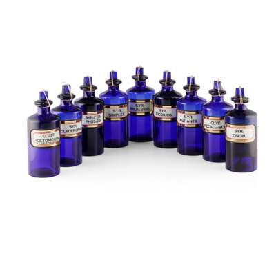 GROUP OF BRISTOL BLUE GLASS PHARMACY BOTTLES