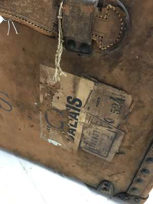 the interior with original linings, label, and removable tray, with old travel labels and owner's monogram on one end, the brass hardware stamped