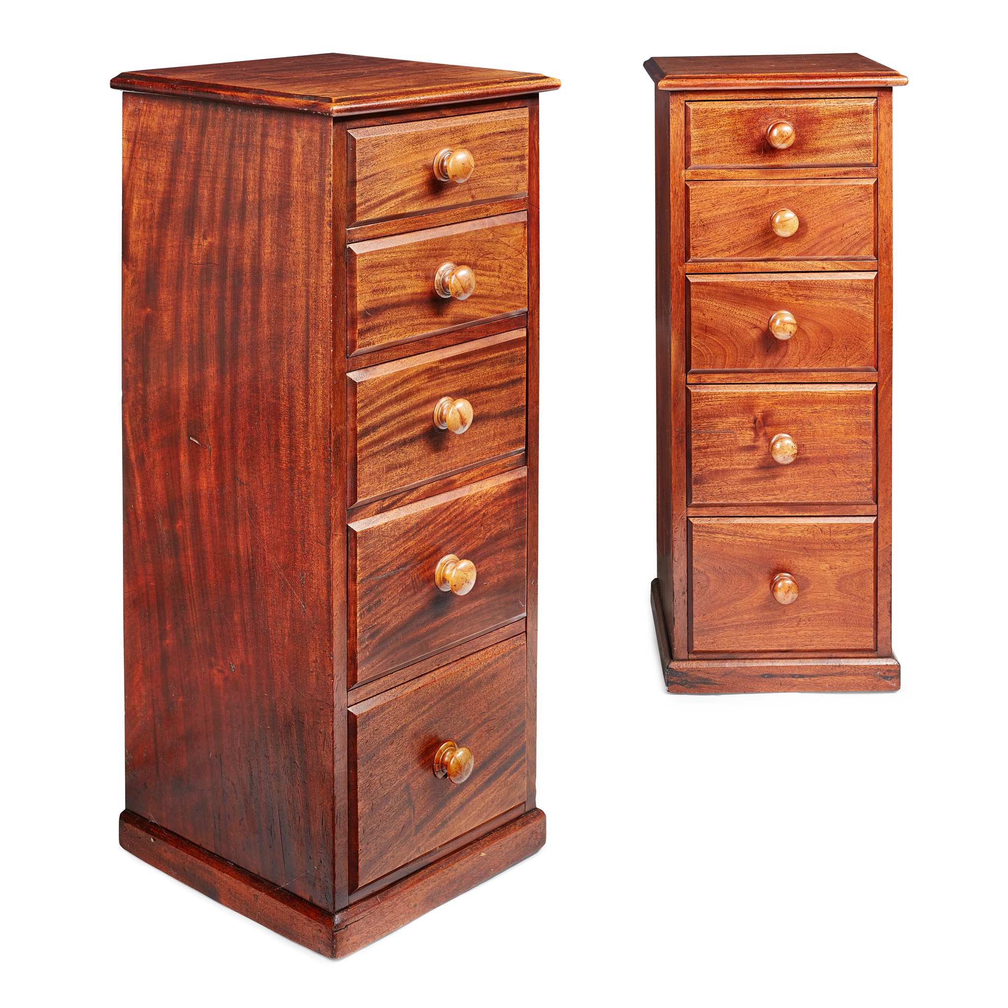 the moulded square tops over five graduated drawers, raised on plinth bases