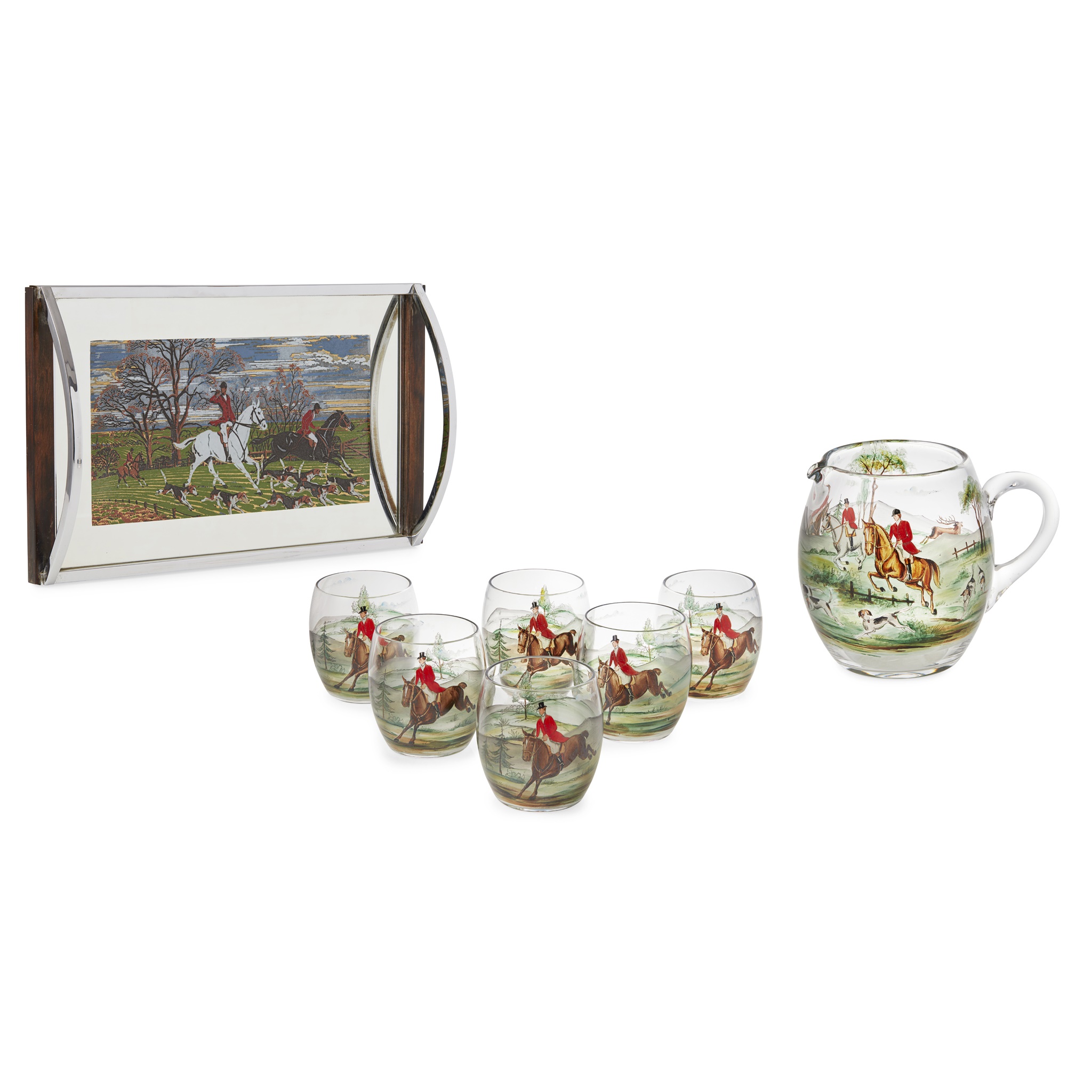 to include a pitcher and six tumblers, enamelled with mounted riders and horses in landscapes, with a chromium and teak mirrored tray with a printed hunting scene
