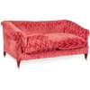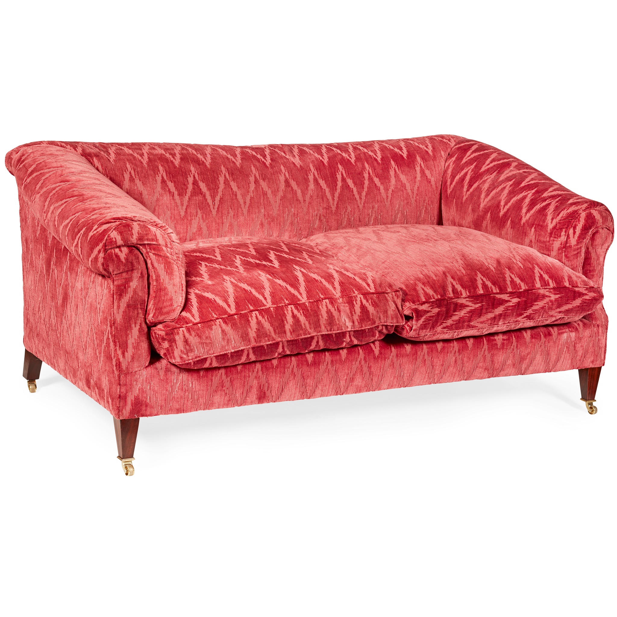 the low back and scrolled arms over a deep seat with twin cushions, raised on square tapering legs with brass castors, in raspberry flame pattern plush upholstery, with label 'HOWARD CHAIRS LTD' to underside