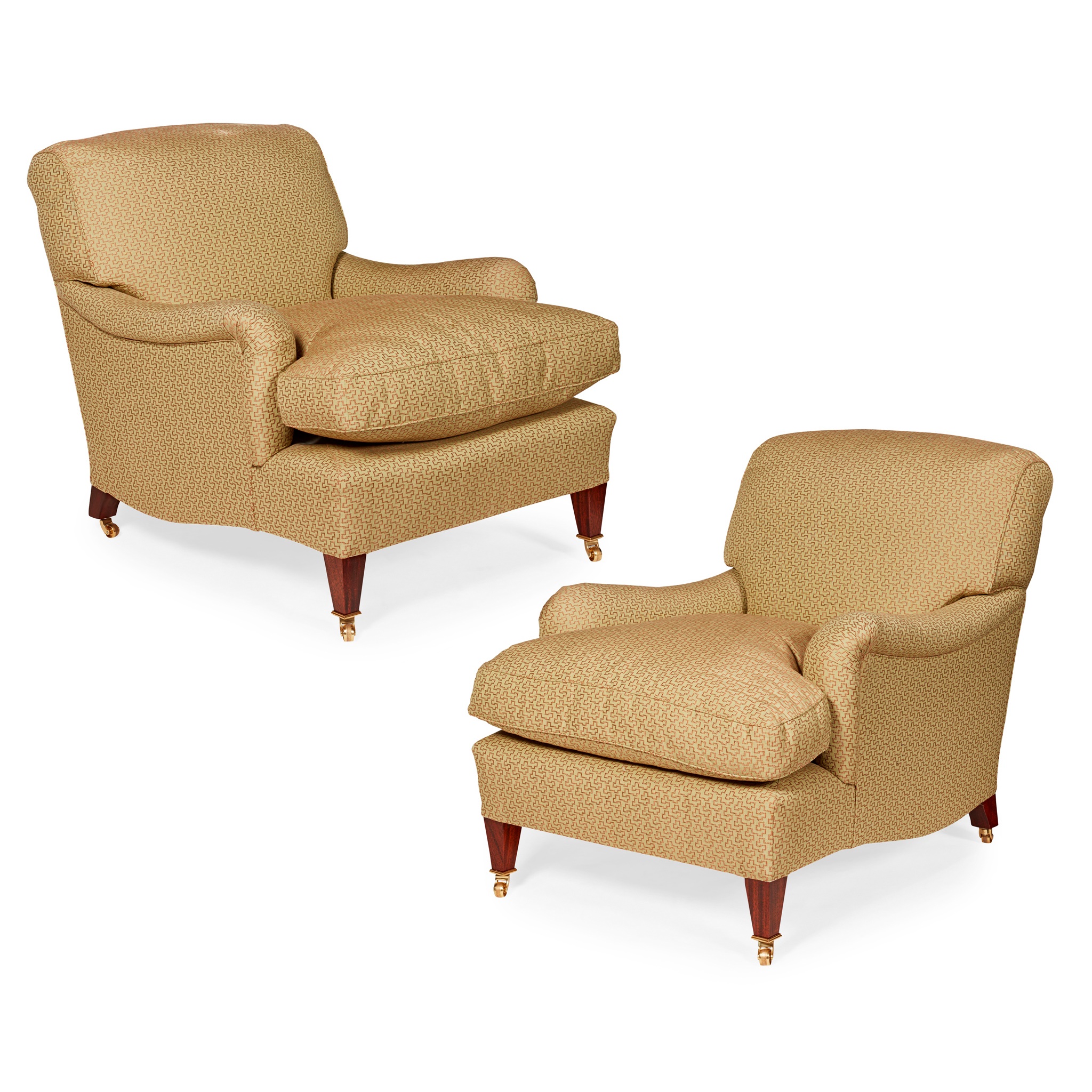 the low backs and scroll arms above deep loose cushion seats, raised on square tapered legs with brass castors, in pale green patterned upholstery, with labels 'HOWARD CHAIRS LTD' to undersides