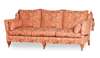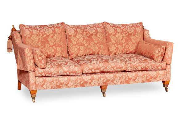 the backs and seats with loose cushions flanked by hinged arms with turned wood finials, raised on square tapered legs with brass caps and castors, covered in terracotta floral damask type fabric