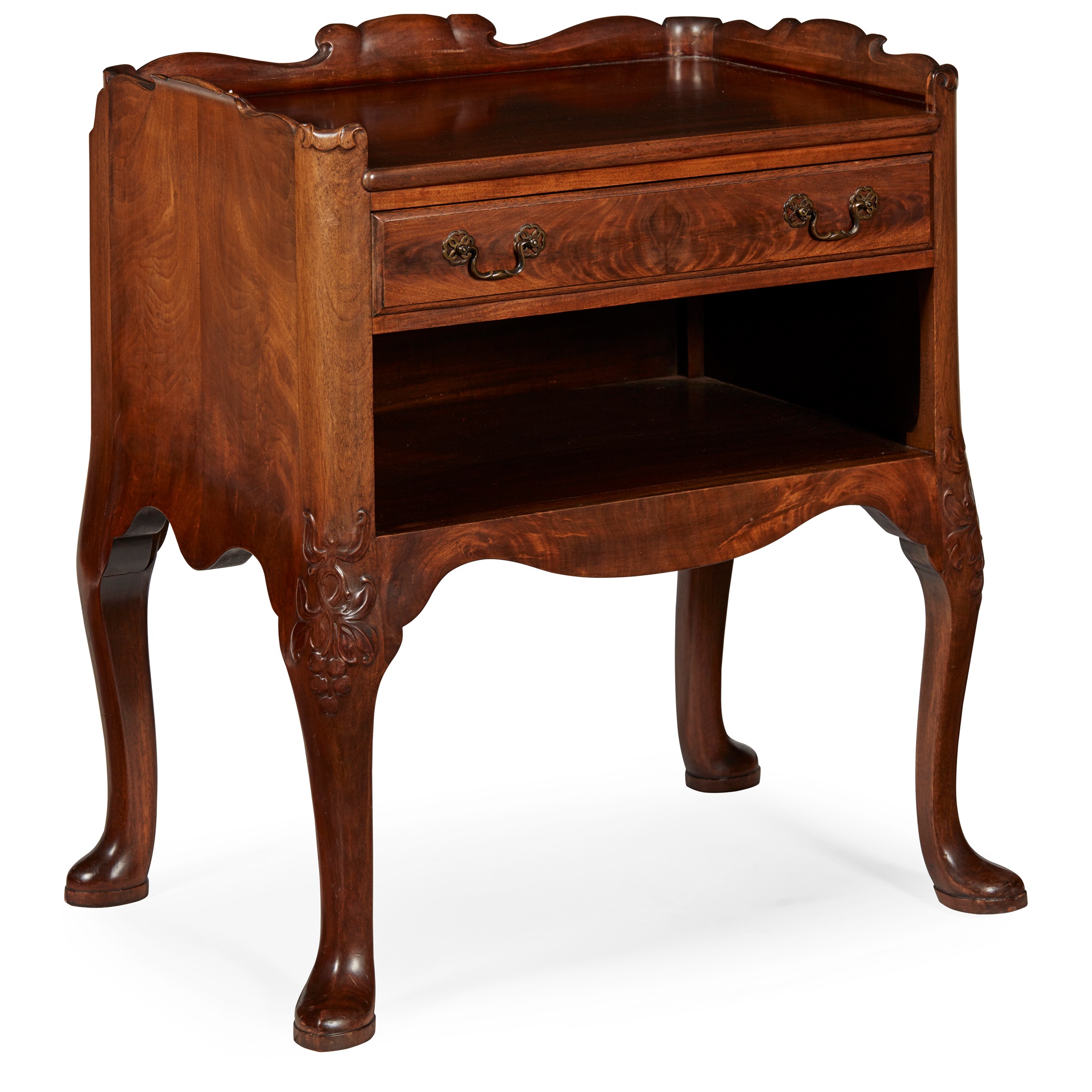 with a scrolled three-quarter gallery and rectangular top over a drawer and shelf, raised on carved cabriole legs with pointed pad feet