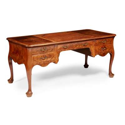 the crossbanded rounded rectangular top with a central leather skiver, above a frieze drawer and shaped kneehole arch flanked by banks of two short drawers, raised on cabriole legs ending in faceted pad feet, maker's stamps in the drawers