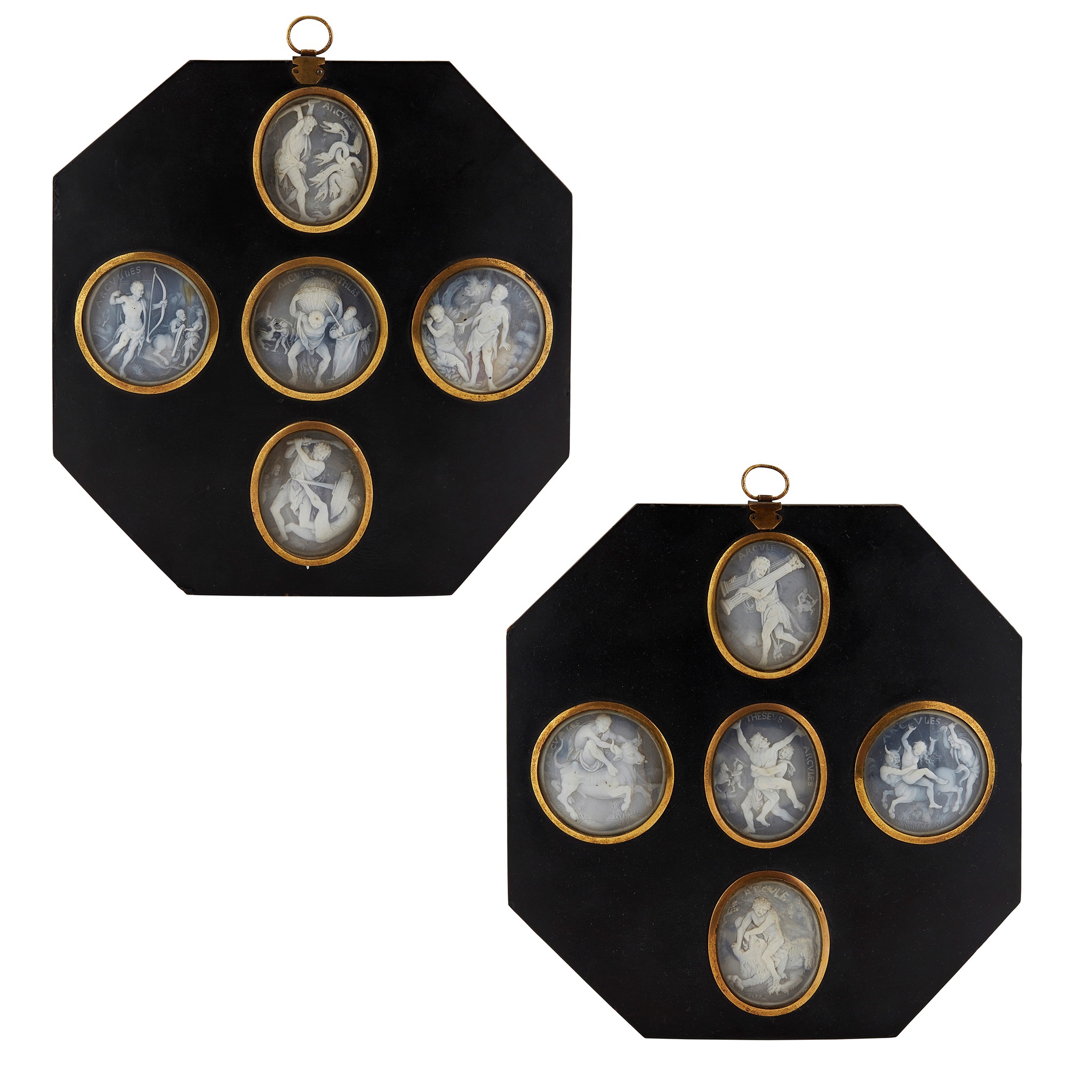 TEN FRAMED CARVED SHELL CAMEOS DEPICTING THE LABOURS OF HERCULES