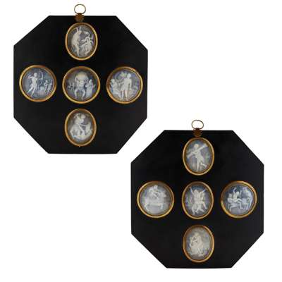 of oval and circular form, variously titled in the margins, mounted in two octagonal ebonised frames with brass bezels