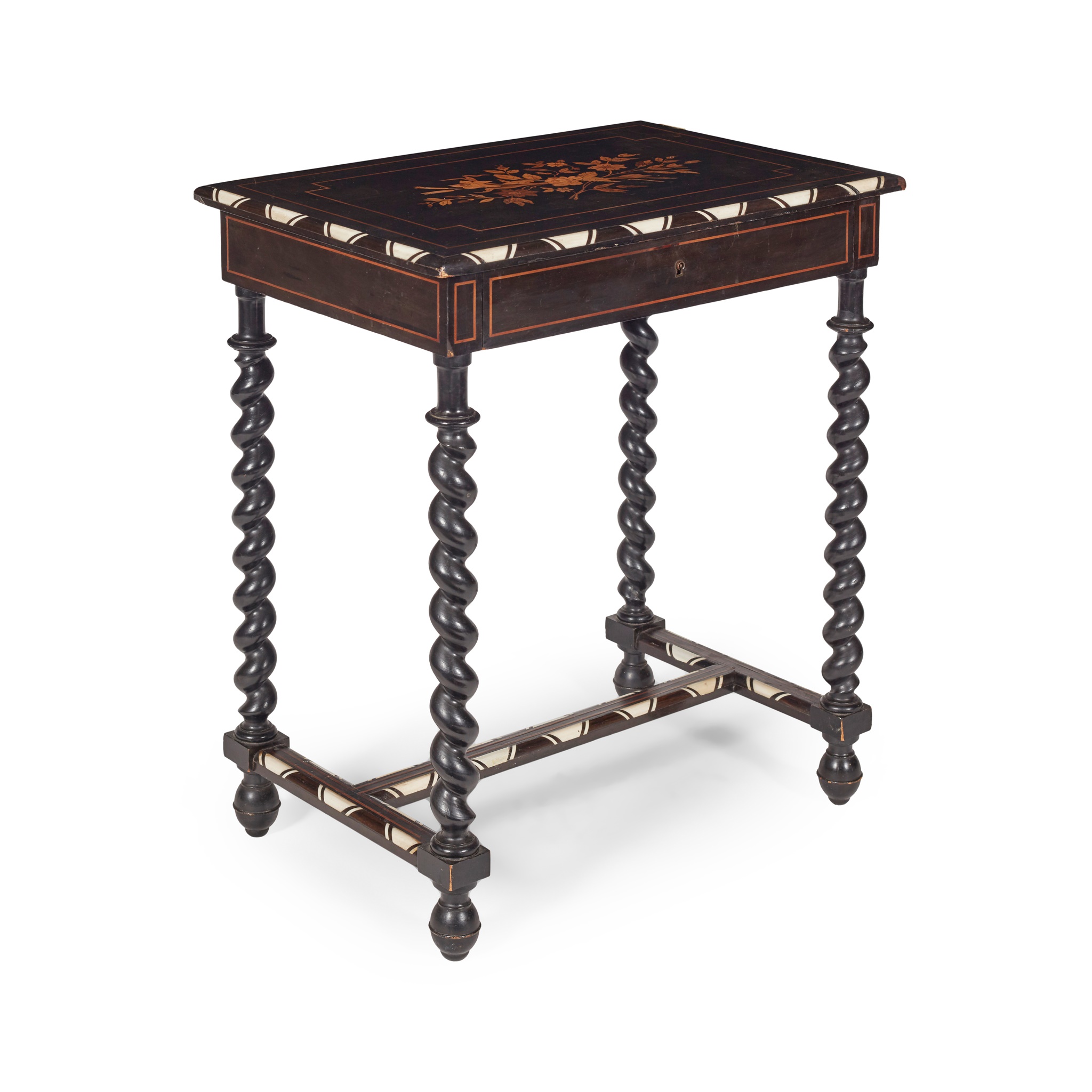 the rectangular top with floral marquetry within a ivory inlaid border, above a frieze drawer, raised on spiral carved legs joined by an H stretcher with conforming ivory inlay