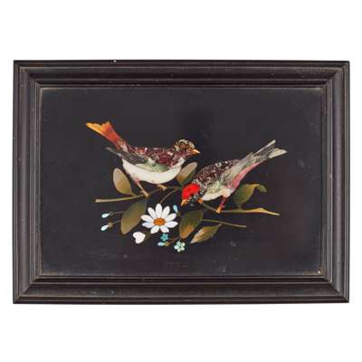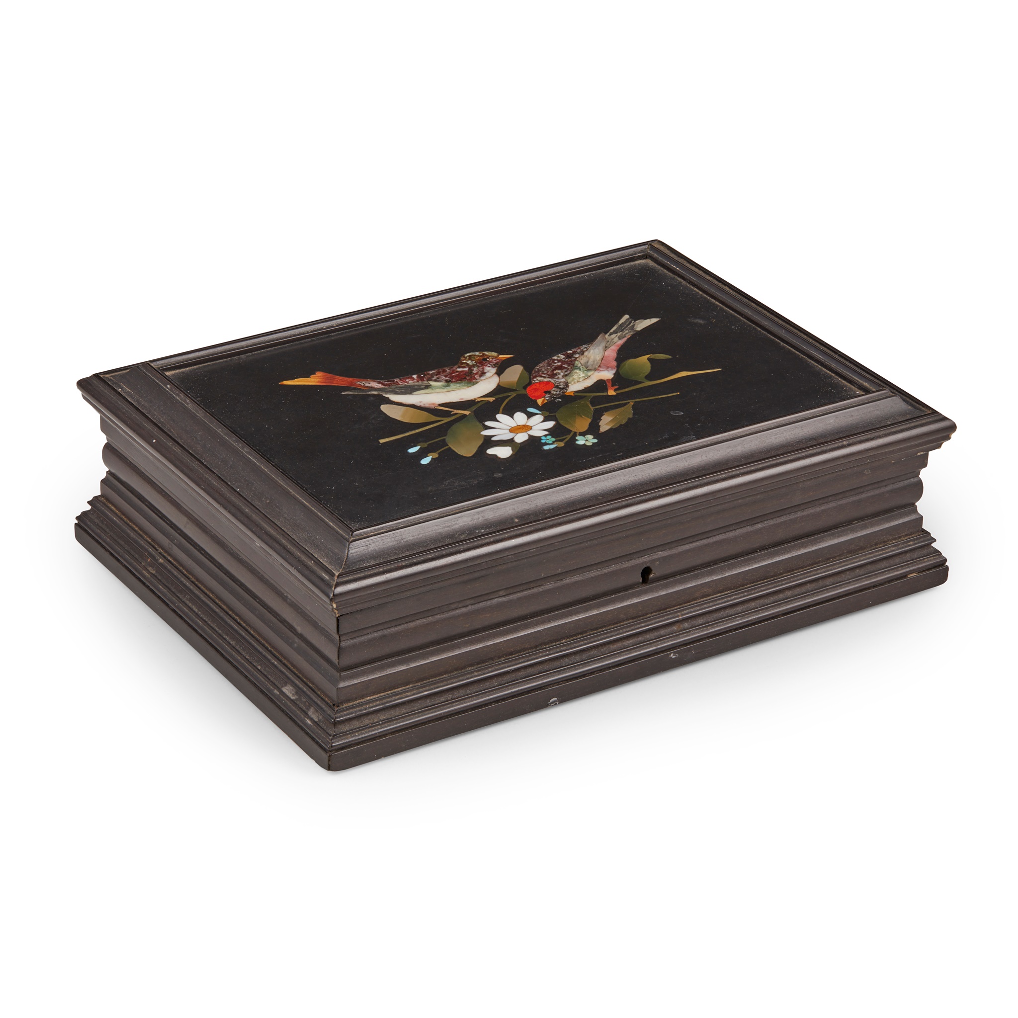 the hinged cover with a pietra dura panel depicting two birds on a branch with flowers, in a moulded ebony frame