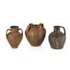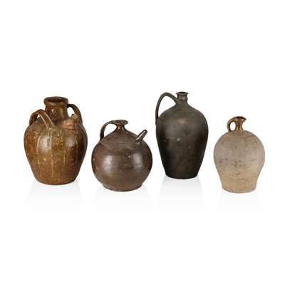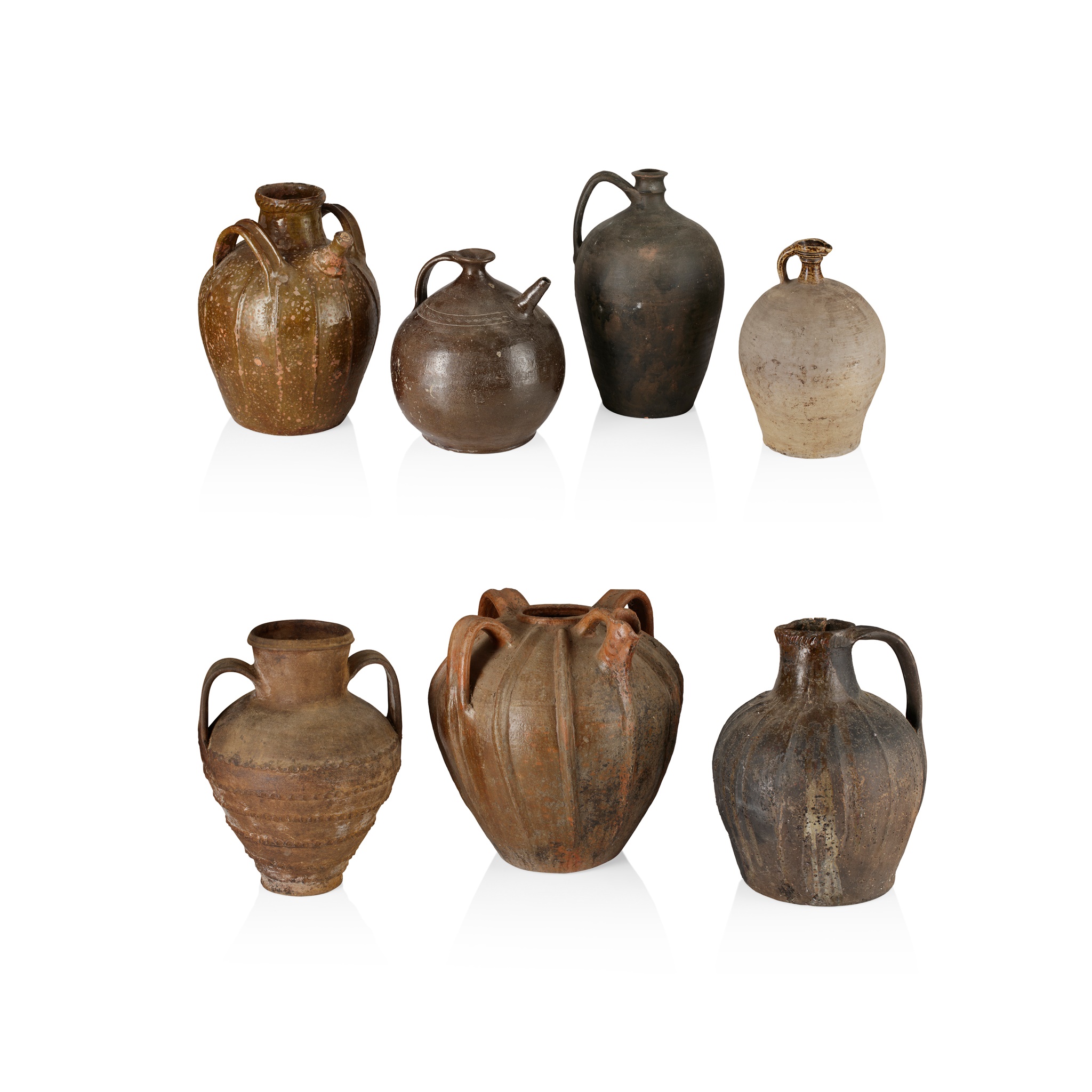 to include a twin-handled jug with pouring spout, the body moulded with vertical ribs, 37.5cm high; a large jar moulded with vertical ribs, with three strap handles and a spout, 44cm high; an amphora with twin strap handles, the body with pinched horizontal bands, 40cm high; a large jug with a strap handle, with a partial dark olive glaze, the body with moulded vertical ribs, 41cm high; a tall slender ovoid jug with matt black glaze and a single strap handle, 38.5cm high; a jug of slender ovoid form, the short strap handle, neck and spout with a mottled glaze, 31.5cm high; and a jug of squat bulbous form, with brown glaze, the upper section with an incised band of stylised decoration, with a strap handle and pouring spout, 29cm high