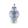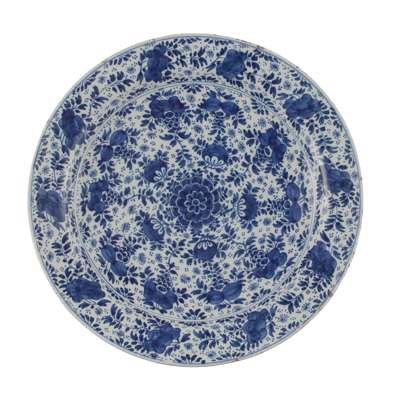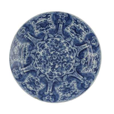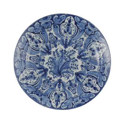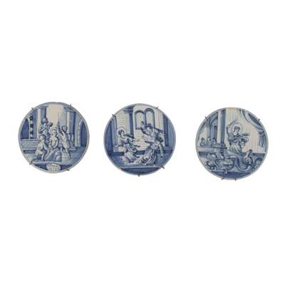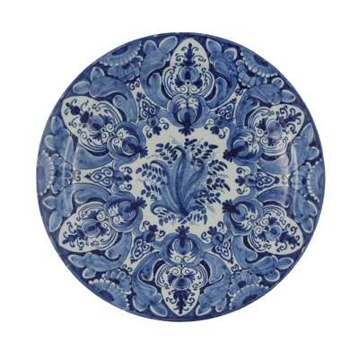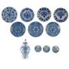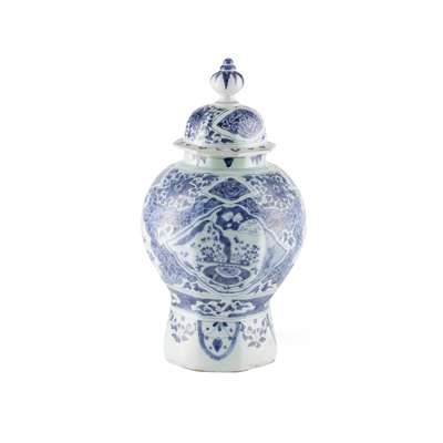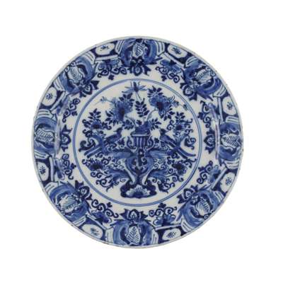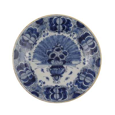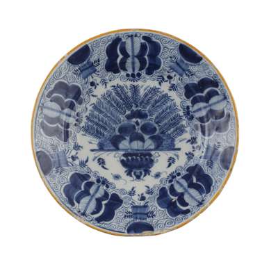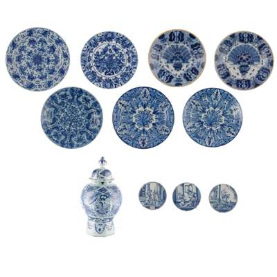 comprising, an 18th century baluster jar and cover of octagonal form decorated with alternating panels depicting a vase issuing flowers and floral designs, on a crackled effect ground, 47cm high; two Dutch delft 'Peacock' pattern plates with yellow rims, one marked ST, 35cm and 27cm diameter; two Dutch delft shallow dishes decorated to the centre with scrolling foliage and leafy branches within panels of stylised designs, marked VE 40, 35.5cm diameter; a large shallow dish decorated with a multipetalled flower to the centre surrounded with numerous flowers and leafy branches, unmarked, 40cm diameter; a further shallow dish, profusely decorated with flowers and panels, 30.5cm diameter; a plate decorated with a vase issuing flowers with perching birds and an insect, within stylised border, 27cm diam; and three three small 19th century round panels depicting biblical scenes, 13cm diameter