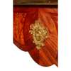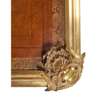 the brass banded top with a tooled and gilt brown leather insert, above a shaped frieze with three short frieze drawers with dummy drawers opposing, raised on squared cabriole legs, with gilt bronze mounts throughout
