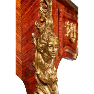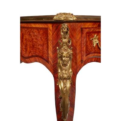 LOUIS XV STYLE KINGWOOD, AMBOYNA, AND MAHOGANY BUREAU PLAT, IN THE MANNER OF CHARLES CRESSENT