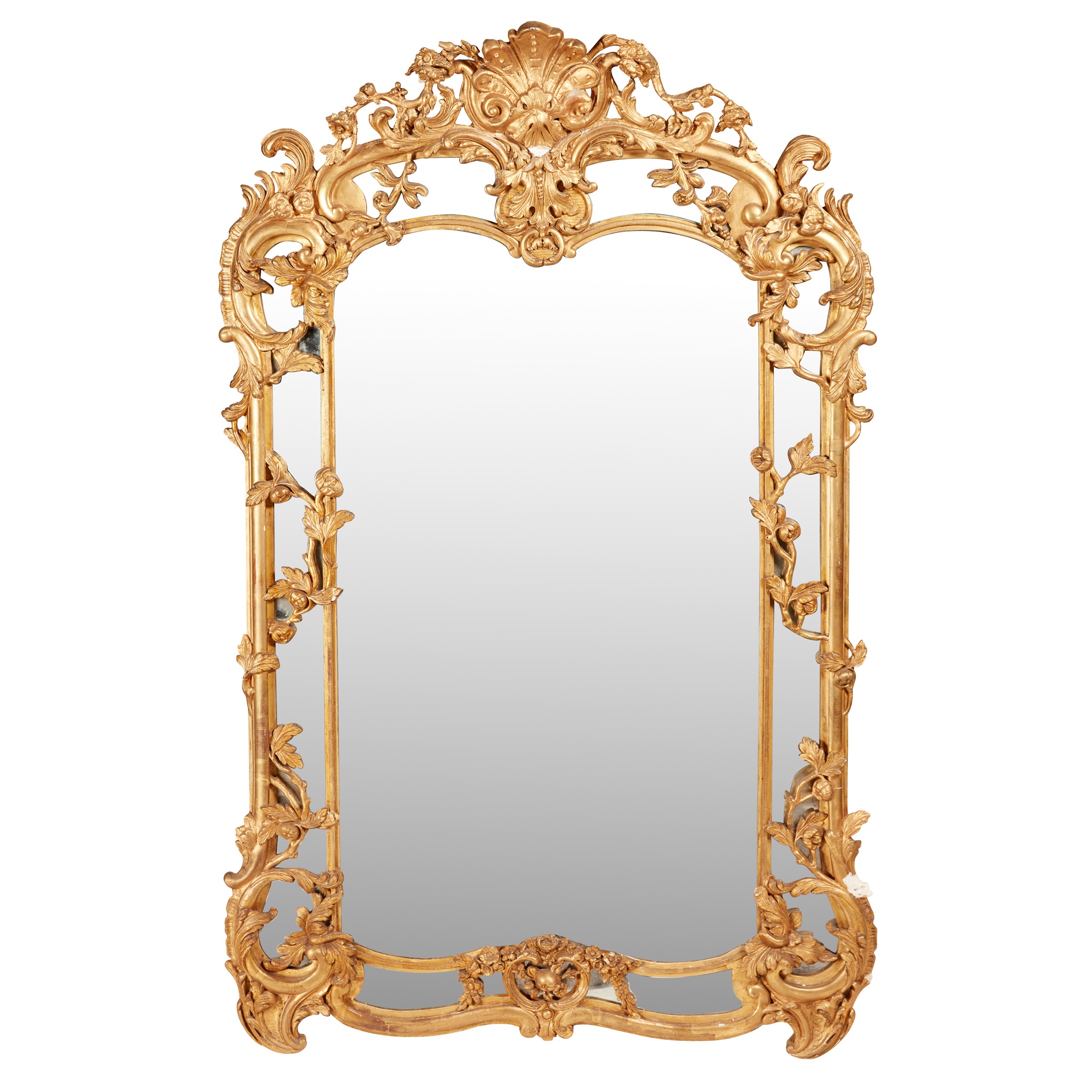 the shaped bevelled mirror plate within margin plates in a openwork giltwood frame with foliate scrolls, trailing flowers and flower heads
