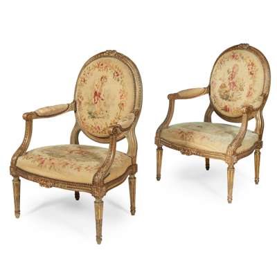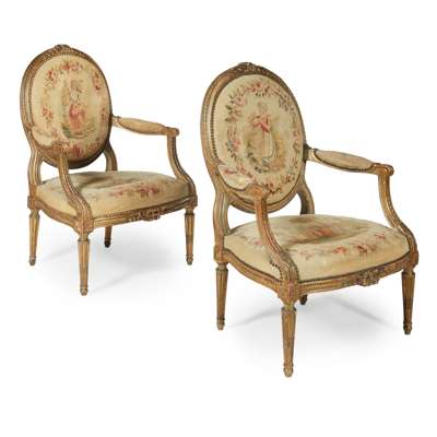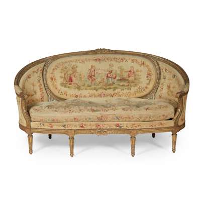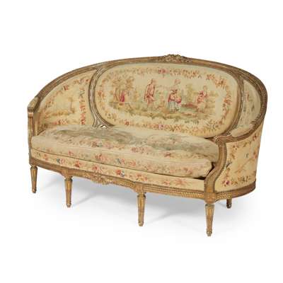 FIVE PIECE SUITE OF LOUIS XVI GILTWOOD AND AUBUSSON SEAT FURNITURE