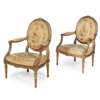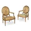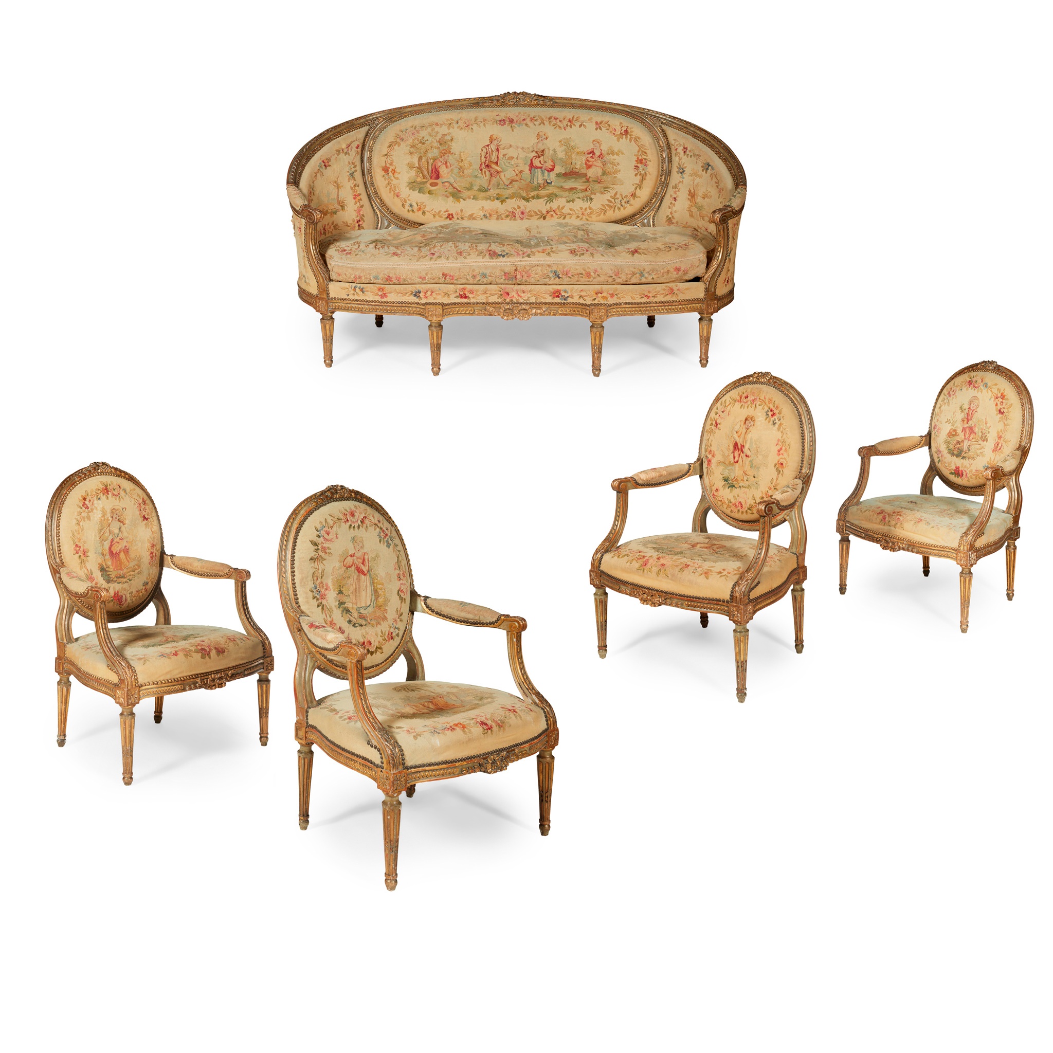 comprising a canapé and four armchairs, the canapé with a padded back over a loose cushion seat, the chairs with oval padded backs above part-padded open arms and stuff-over seats, all raised on fluted tapered legs, the frames carved with guilloche, acanthus, and bead and reel with flower crestings; all covered in Aubusson tapestry with oval reserves depicting bucolic scenes of children at play, animals and foliage