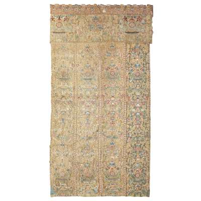 comprising four joined strips and a base panel, each woven with floral and foliate columns, the base similar, with shaped fringe, old label attached inscribed 'Duchess of Roxburghe'